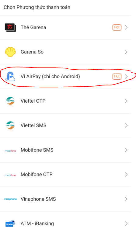 Sau khi đăng nhập thành công, chúng ta chọn thanh toán qua ví AirPay. Để dùng chức năng này, các bạn nên có tài khoản thẻ ATM và cài đặt airpay trên andoird liên kết trước mới thanh toán được.