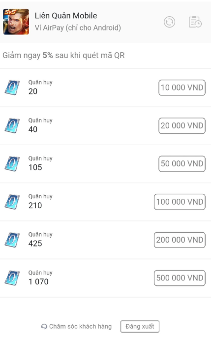 Chọn các mức nạp thẻ đều được giảm giá 5%. Mình toàn chọn nạp như vậy.